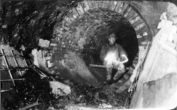 Kloakktunnel med indre teglsteinsbekledning. Muligens under Wessels plass. Fra 1920-tallet. Anlegg av hovedledning for kloakk til Festningen. Arbeider.