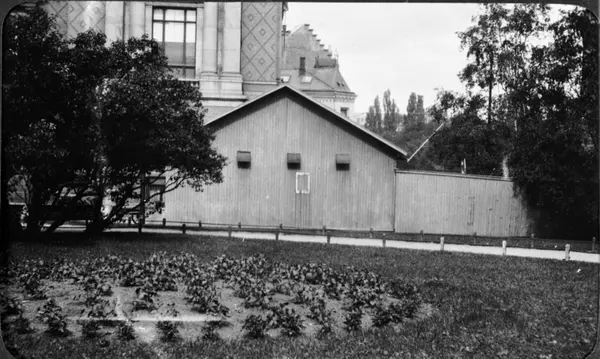 Arbeidsbrakke for vann- og kloakkvesenet på Wessels plass under byggingen av kloakkrørledning på stedet. Frimurerlosjen bak til venstre. Fra 1920-tallet.