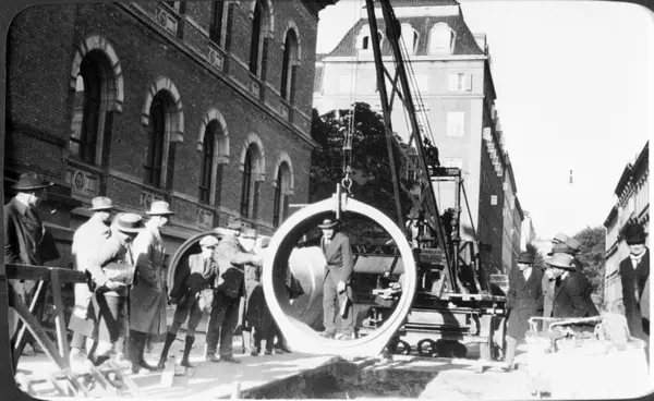 Oppgradering av rørledning for Bislettbekken ved Nasjonalgalleriet. Vannverkssjef Ove Owe står i røret. Hotell Savoy i bakgrunnen. Bislettbekken ble lagt i rør (gråstein) på 1850-tallet.