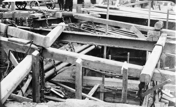 Arbeide med graving for legging av kloakkrørledning. Bjelker og reisverk i tre. Tauverk og kjettinger. Forskaling. Muligens fra Kirkegata. Fra 1920-tallet.