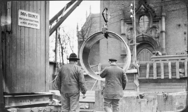 Arbeide med kloakkrørlegging i Kirkegata utenfor Oslo Domkirkes hovedinngang. Løftekran og kranhus med plakattekst: "PAY & BRINCK MASKINFORRETNING & MEK. VERKSTED". Fra 1920-tallet.