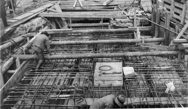 Arbeide på kabelkum for nedgang til fellestunnel (kloakk, vann, gass, telefon, elektrisitet). Armering. Støttekonstruksjoner. Fra Torggata ved Linaaes gate. Fra 1920-tallet.