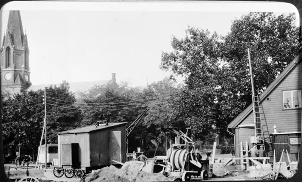 Gravearbeide ved Ankertorget under hovedkloakkrør- og fellestunnelleggingen. Sementblander. Løftekran. Trillebårer. Akissehus, tårnet på Jakob kirke. Fra 1930-tallet.