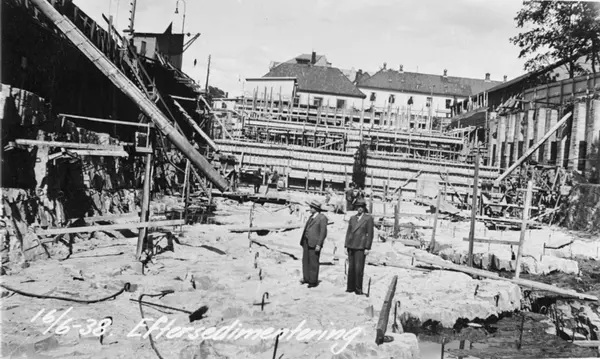 Utgravning ved byggingen av Festningen (og Oslos nye) kloakkrenseanlegg i Kongens gate. Fylling med sedimentlag. Ledere i vann- og kloakkvesenet inspiserer.
