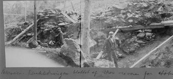 Graving ved bygging av forstøtningsmur mot kloakkrørledning. Støtteverk. Villa i dragestil i bakgrunnen til venstre (på Sarabråten). Albumtittel: "Akers Vand- og Kloakvæsen Fotografier af Anlæg"