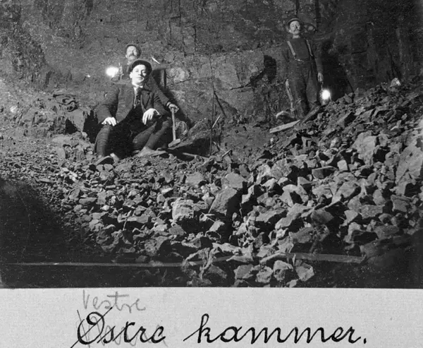 Arbeidere med redskaper og tunnellykter oppstilt til fotografering. Tunnelgang mot Grefsenreservoaret med uthugget steinmasse. Albumtittel. "Akers Vand- og Kloakvæsen Fotografier af Anlæg"