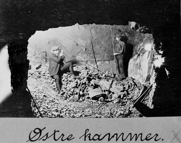 Målearbeide i tunnelgang ved innslaget mot vest. Mann med nivellerstang. Tunnelredskaper. Albumtittel: "Akers Vand- og Kloakvæsen Fotografier af Anlæg"