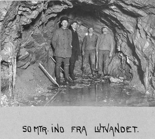 Tunnelarbeidere og ledere innen vannverket oppstilt til fotografering i tunnelen ut fra Lutvann. Tunnelredskaper. Vanninntaket sto ferdig i 1918. (Nedlagt 1974.) Albumtittel: "Akers Vand- og Kloakvæsen Fotografier af Anlæg"