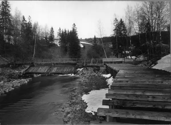 Kar i dammen og langs kanten som skal stoppe tømmeret. Elvebro. Plassen Grønvold i bakgrunnen. Akerselva, Frysja, Brekke.