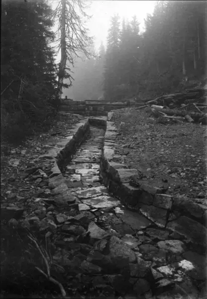 Grimtjernsdammen . Steinlagt avløp / elveløp.