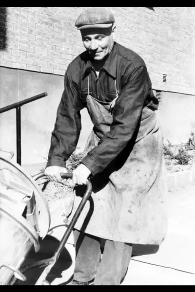 Renovasjonsarbeider med søppeltralle og søppelkasse, visstnok spesialdesignet for Renholdsverkets Norba-biler. Søppelkassen veide 28kg.Kilde: "Ved renhold og orden skabes sundhed og liv. RAF 100 år" (Hegna, T og Messel, J (1995))