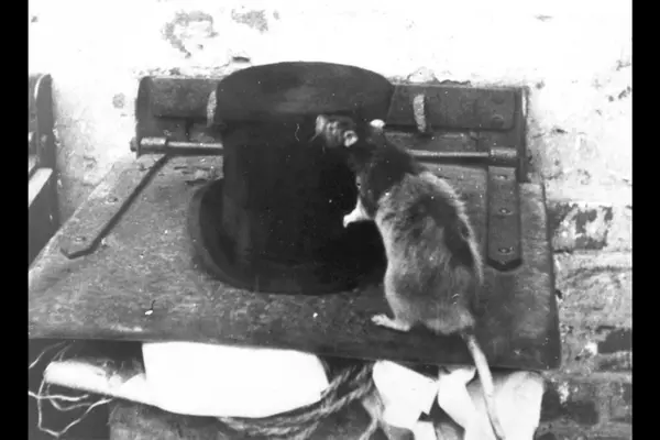 Rotte snuser på flosshatt. Overfylt søppelkasse. Bildet er tatt i forbindelse med filminnspillingen av "Rehnholdsverket" (1952, regissør Finn Carlsby), en film produsert av Oslo kinematografer A/S og del av prosjektet Oslofilm. Les mer om Oslofilmer på http://www.byarkivet.oslo.kommune.no/film/