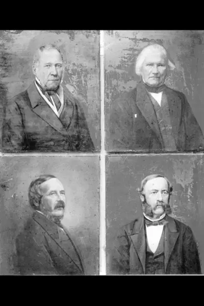 Avfotograferinger av Nydalen Compagnies grunnleggere. Øverst til venstre Fogd Ole Gjerdrum, øverst til høyre grosserer Hans Gulbranson, nederst til venstre grosserer Adam Hiorth, og nederst til høyre ingeniør Oluf N. Roll. Avfotografert i forbindelse med jubileumsboken i 1945