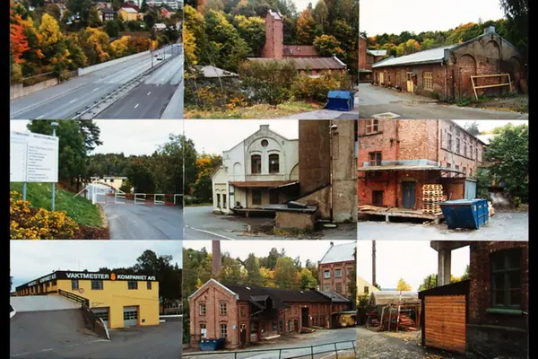 Nyere fargebildemontasje av Nydalen Compagnie sitt område. Antakelig slutten av 70-tallet. Bildet øverst til venstre er av arbeidboligene på oversiden av Ringveien og Gjøvikbanen