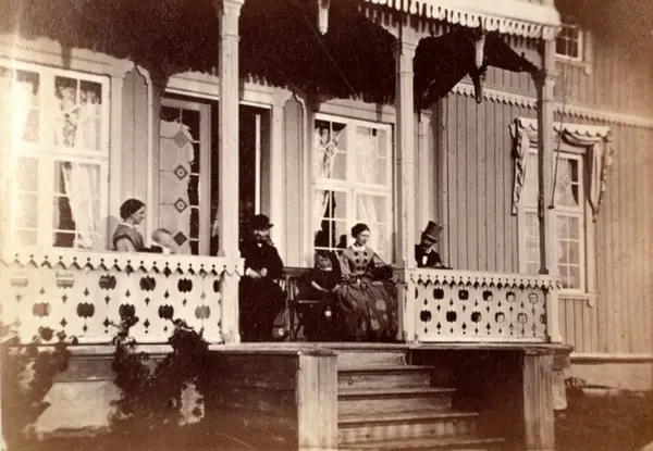 Skrevet på bildet: "Fra venstre: Fru Olsen, Olai Olsen, fru Horn, Kjøbm. Horn (Egertorget). Foran. 4 Fin Horn. (Arkitekt, overlærer)"(Horn er besteforeldre til Edith Falck-Ytter)