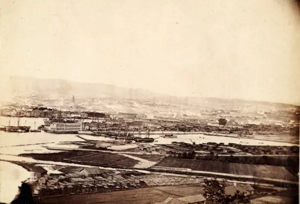Seilskuter ved havn. Dette er en fortsettelse av forrige bilde (A-10408/U/0001/003) rundt den indre del av Bispevika. Legg merke til at ingen stører båter kan gå så langt inn. Den store bygningen til venstre er Nylands verksted. Vår Frelsers kirke skimtes lenger bak. Den lange lave bygningen innenfor kan kanskje ha noe med Grønland å gjøre? I forgrunnen passerer Loelva (Alna), og hitenfor den ser vi også noen trelasttomter.