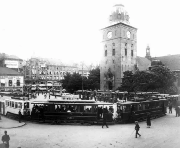 Stortorvet. Sporvognstrafikk, Ekebergbanen ytterst til venstre, Kristiania Sproveisselskaps sporvogner i front og bak. Oppstilling av mange vogner, en slags parade eller markering?