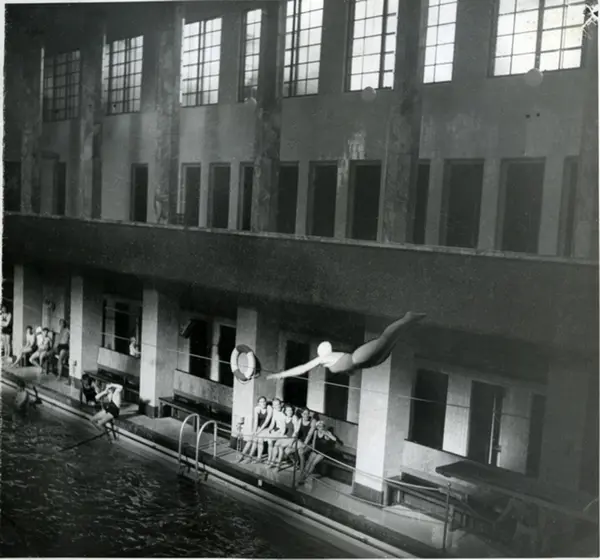 Svømmehallen i Torggata bad. Kvinne i fritt stup. Tilskuere langs bassengkanten og i vannet. I bakgrunnen ses skiftekabinene i første og andre etasje. Galleriet (2. etasje) med 36 avkledningsrom og 2 felles-garderober. Til svømmehallen (1. etasje) 76 enkeltrom og 3 fellesgarderober med 77 skap.