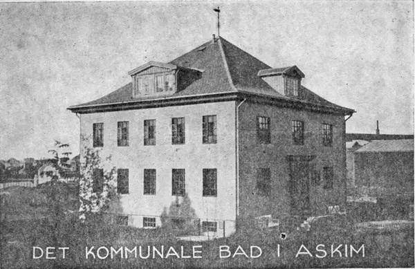 Det kommunale bad i Askim. Åpnet 1931. Svømmehallen åpnet 1936. Badet nedlagt i 1985. Første landkommune i Norge med offentlig bad. I dag integrert med det nye Østfoldbadet. Postkort.
