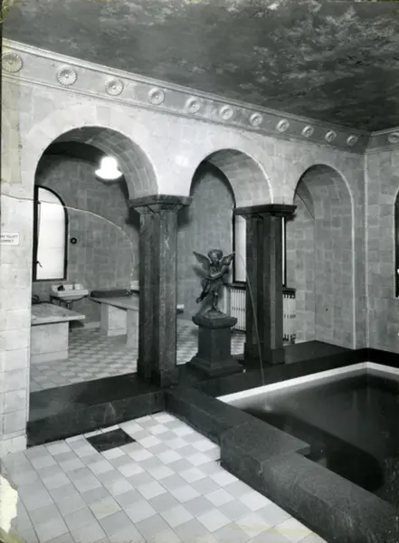 Torggata bad. Badstue Avdelingen for menn med avkjølingsbasseng og marmorbenker for massasje og såpevask. Skulpturen Badeengel som ble flyttet til Bislett bad etter nedleggelsen i 1980. Vinduer mot bakgård og Badstugata.