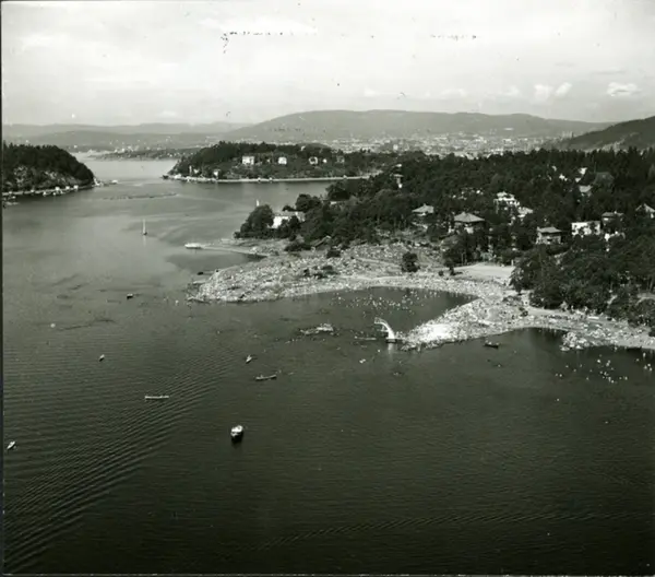 Ulvøya med villabebyggelse. Sydstranda med yrende sol og badeliv. Badeflåte og stupetårn. Malmøya (til venstre) og Ormøya med Beikøya i bakgrunnen. Flyfoto. Påskrift album: Ulvøya med Sydstranna bad.