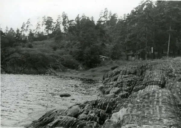 Rolfstangen badested. Søndre strand sett mot sør over en bergknaus bestående av kambrosilurske avsetninger. Uopparbeidet areal adskilt med et plankegjerde. Naust eller en strandsitterbolig til høyre i bildet.
