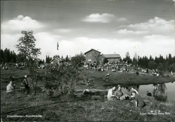 Ullevålseter. Utfart og serveringsted (serveringsted siden 1927). Markastua har to store stuer. Tunet foran setra og tjernet fylt opp med rastende turgåere. Postkort med påskrift: Ullevålster, Nordmarka.