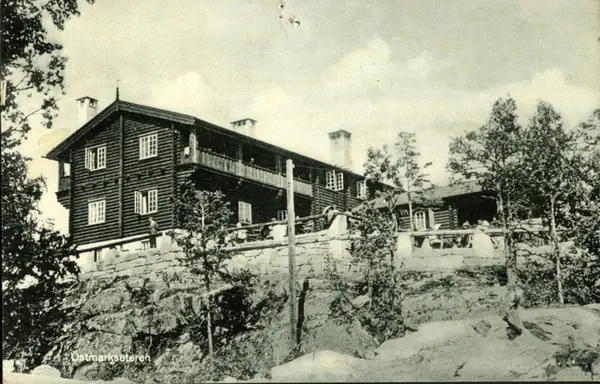 Østmarkseteren beliggende høyt og fritt på åsen over Ulsrudvann. Bygget som et utfartssted for friluftsfolket i 1926 men brant året etter. Åpnet igjen 1928. Postkort med påskrift Östmarkseteren.