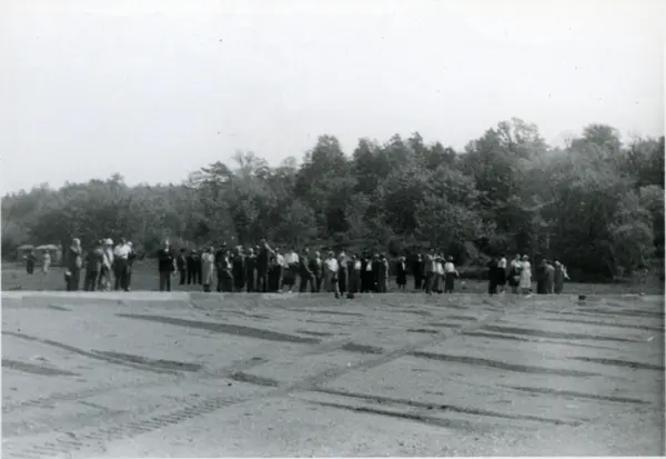 Langøyene. En komite på befaring ved den halvmåneformede stranden på den sørvest vendte siden av øya. Stranden opparbeidet og påføres løs sand. I bakgrunnen ses den store gressletta og Søndre Langøya.Vedtak fra 1947 som friluftsområde.