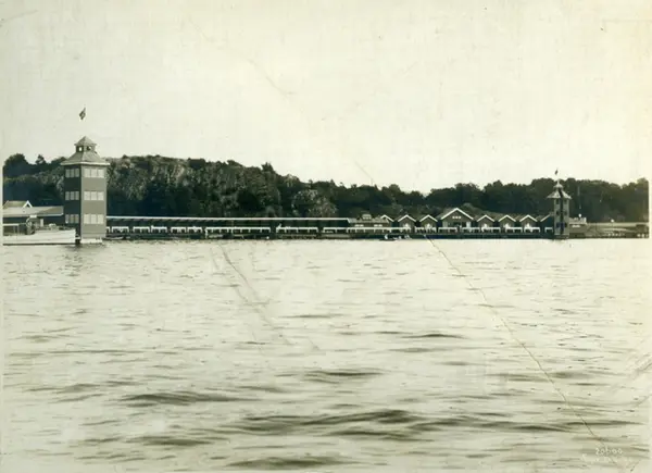 Hovedøyas herrebad som strekker seg rundt bassenget,med fri badehuset fra venstre til betalingsbadet på høyre side med stupetårnet. Til venstre i bildet ses badebåten/ferga fortøyet til kai. Badebrygge midt i bassenget. Påskrift under bildet: Hovedøens fribad og betalingsbad for mænd.