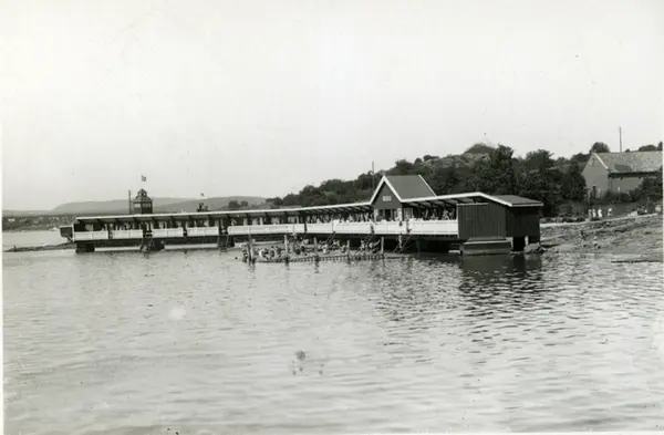 Hovedøya bad. Fribadet for damer med hovedinngangen og le/skifteskurene som strekker seg langsetter på hver side. De to tårnene i bakgrunnen er fra herrebadet. Badende kvinner og barn. Til høyre i bildet sandstranda og Lindøysund kruttmagasin i bakgrunnen.