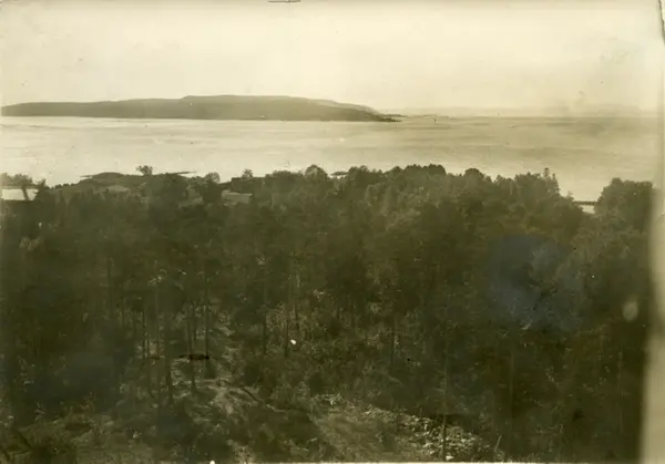 Hovedøya. Bildet er tatt fra et av stupetårnene på Hovedøya bad, sørover mot indre Oslofjord, med øyene og Nesoddlandet i bakgrunnen. Trehusbebyggelse. Påskrift på album: Utsikt fra stupetårnet på Hovedøya.
