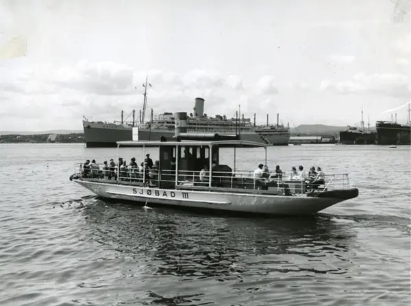 Oslo kommunale badefrege, Sjøbad III på vei ut fra Rådhuskaia ved Akershusstranda i Pipervika, på vei til en av øyene ute i fjorden. Passasjerskipet Orion til ankers utenfor dokkanlegget til Aker mekaniske verksted. Frammuseet på Bygdøy helt i bakgrunnen.