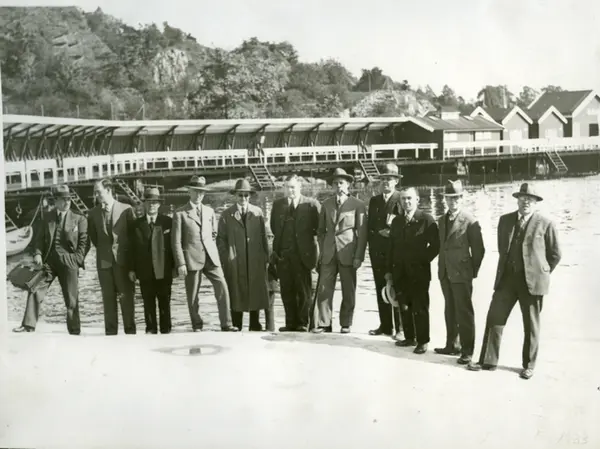 Hovedøya bad. Delegasjon på befaring av badeanlegget, stående på skjæret inne på herrebadets fribad. I bakgrunnen ses le/skifteskurene som strekker seg frem til betalingsbadet. Påskrift bilde: 1933.
