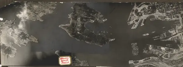 Flyfoto over Hovedøya med Lindøya, Gressholmen og Bleikøya. Bjørvika fra Vippetangen til Kongshavn. Skip i opplag utenfor Hovedøya og innover i havnebassenget i Bjørvika. Bilde merket: Offentlig gjørelse forbudt. Sammensatt bilde.