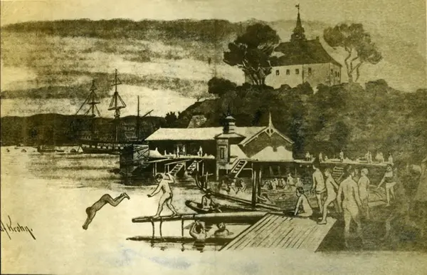 Akershusstranda. Tegning av badende gutter ved badehusene, Studentbadehuset Sjølyst og Det militære badehus i bakgrunnen. Skoleskipet Christiania (Skoleskip fra 1881-1901) for anker utenfor Akershusstranda. Akershus Slott og Blåtårnet. Papir limt på papp.