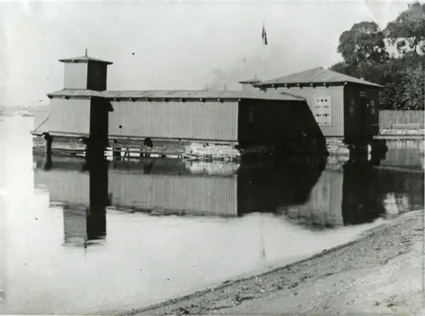 Akershusstranda. Baksiden av Studentbadehuset Sjølyst med trebro over mot hovedinngangen til badet. Bildet tatt fra Vippetangen mot Pipervika. Badet lå omtrent der Kongensgate munner ut mot Pipervika. Akershus slott øverst i bildet. Legg merke til sandstranden nederst i bildet.