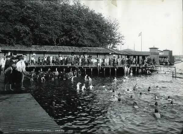 Akershusstranda. Det militære badeanlegg (badehuset) utenfor Akershus festning. Ble også benyttet av elever fra noen kommunale skoler og institusjoner. Bildet fra 1905 viser et forfallent anlegg og i 1907 åpnet havnebanen over Vippetangen. Anlegget måtte da vike plassen. Til høyre ses studentbadet Sjølyst. Påskrift i bildet: 4386 Festningens fribad Væring eneberettiget 1905.