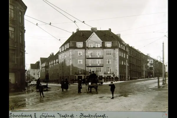 Krysset Vogts gate / Bentsebrugata. Hest og kjerre i krysset. Fra kvartal II i Torshovkvartalene (Torshovbyen). Sannsynligvis fra 1920-tallet. Albumtittel: "Fotografier over Kristiania kommunes boligbebyggelse".