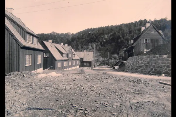 "Utsikten Husvilde-barakker", rekkehus for husløse i Valhallveien. Sannsynligvis fra 1920-tallet. Albumtittel: "Fotografier over Kristiania kommunes boligbebyggelse".