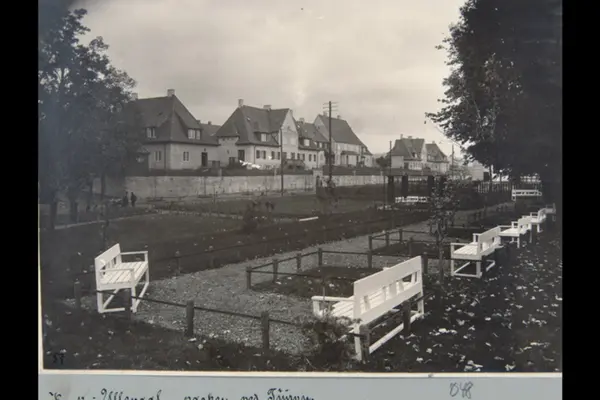 Er sannsynligvis fra kvartal III i Ullevål Hageby. Benker og grusganger i parken ved hjørnet Tiurveien / John Colletts alle. Sannsynligvis fra 1920-tallet. Albumtittel: "Fotografier over Kristiania kommunes boligbebyggelse".