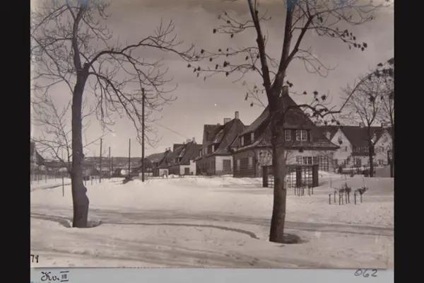 Kvartal III i Ullevål Hageby. Husrekke langs John Colletts alle. Sannsynligvis fra 1920-tallet. Albumtittel: "Fotografier over Kristiania kommunes boligbebyggelse".