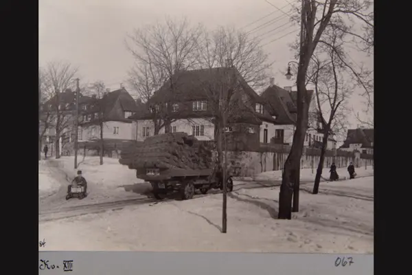 Kvartal XIII i Ullevål Hageby. John Colletts alle. Mann på kjelke. Lastebil med lass av strå? Sannsynligvis fra 1920-tallet. Albumtittel: "Fotografier over Kristiania kommunes boligbebyggelse".
