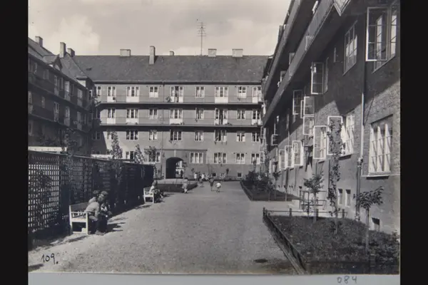 Husfasader mot indre gårdsplass i kvartalet Vogts gate, Hegermanns gate, Omsens gate (tidl. Kildals gate) og Torshovgata. Fra kvartal VI i Torshovkvartalene (Torshovbyen). Sannsynligvis fra 1920-tallet. Albumtittel: "Fotografier over Kristiania kommunes boligbebyggelse".