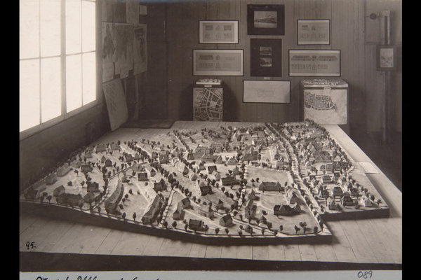Modell av Ullevål Hageby. Tegninger og foto på veggen. Sannsynligvis fra 1920-tallet. Albumtittel: "Fotografier over Kristiania kommunes boligbebyggelse".