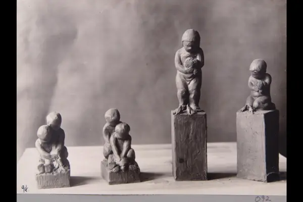 Fire barneskulptur-utkast til besmykning ved dammen på Damplassen (to til venstre) og parken ved Tiurveien på Ullevål Hageby. Sannsynligvis fra 1920-tallet. Albumtittel: "Fotografier over Kristiania kommunes boligbebyggelse".