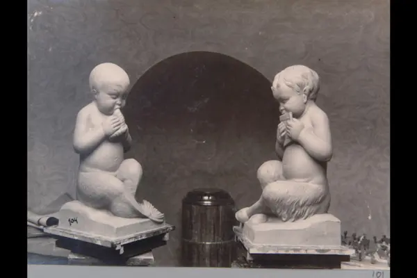 Spillende barn (fantasiskulpturer) til vannfontene? Sannsynligvis fra 1920-tallet. Albumtittel: "Fotografier over Kristiania kommunes boligbebyggelse".