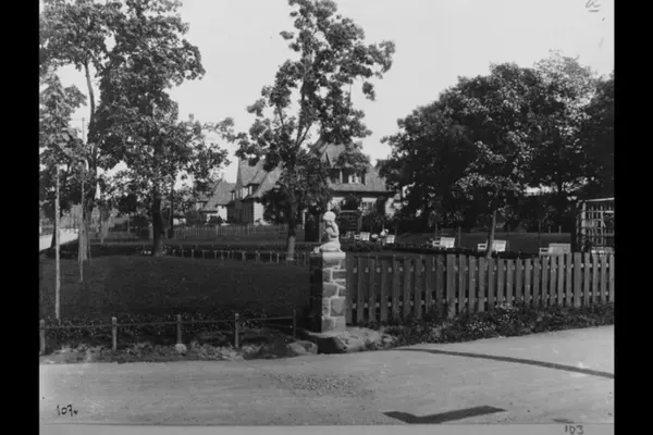 Parken ved krysset Tiurveien / John Colletts alle. Barnestatue på sokkel. Parkbenker. Sannsynligvis fra 1920-tallet. Albumtittel: "Fotografier over Kristiania kommunes boligbebyggelse".