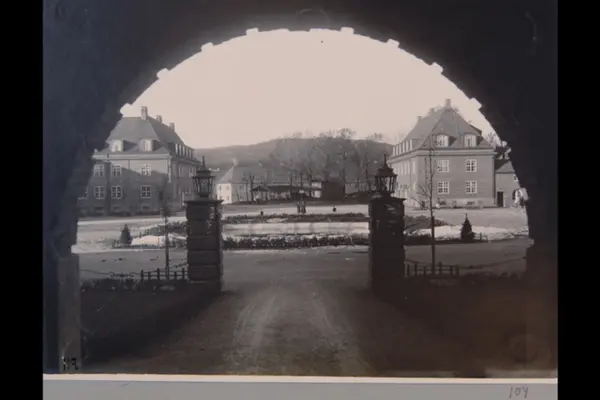 Damplassen med vanndammen i Ullevål Hageby, sett gjennom en portal / buegang. Sannsynligvis fra 1920-tallet. Albumtittel: "Fotografier over Kristiania kommunes boligbebyggelse".