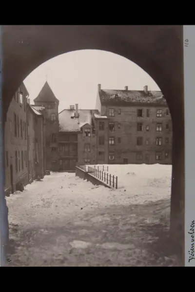 Husfasader mot indre bygård i kvartal A i Vøyenvollen-komplekset, sett gjennom en portal / buegang. Sannsynligvis fra 1920-tallet. Albumtittel: "Fotografier over Kristiania kommunes boligbebyggelse".
